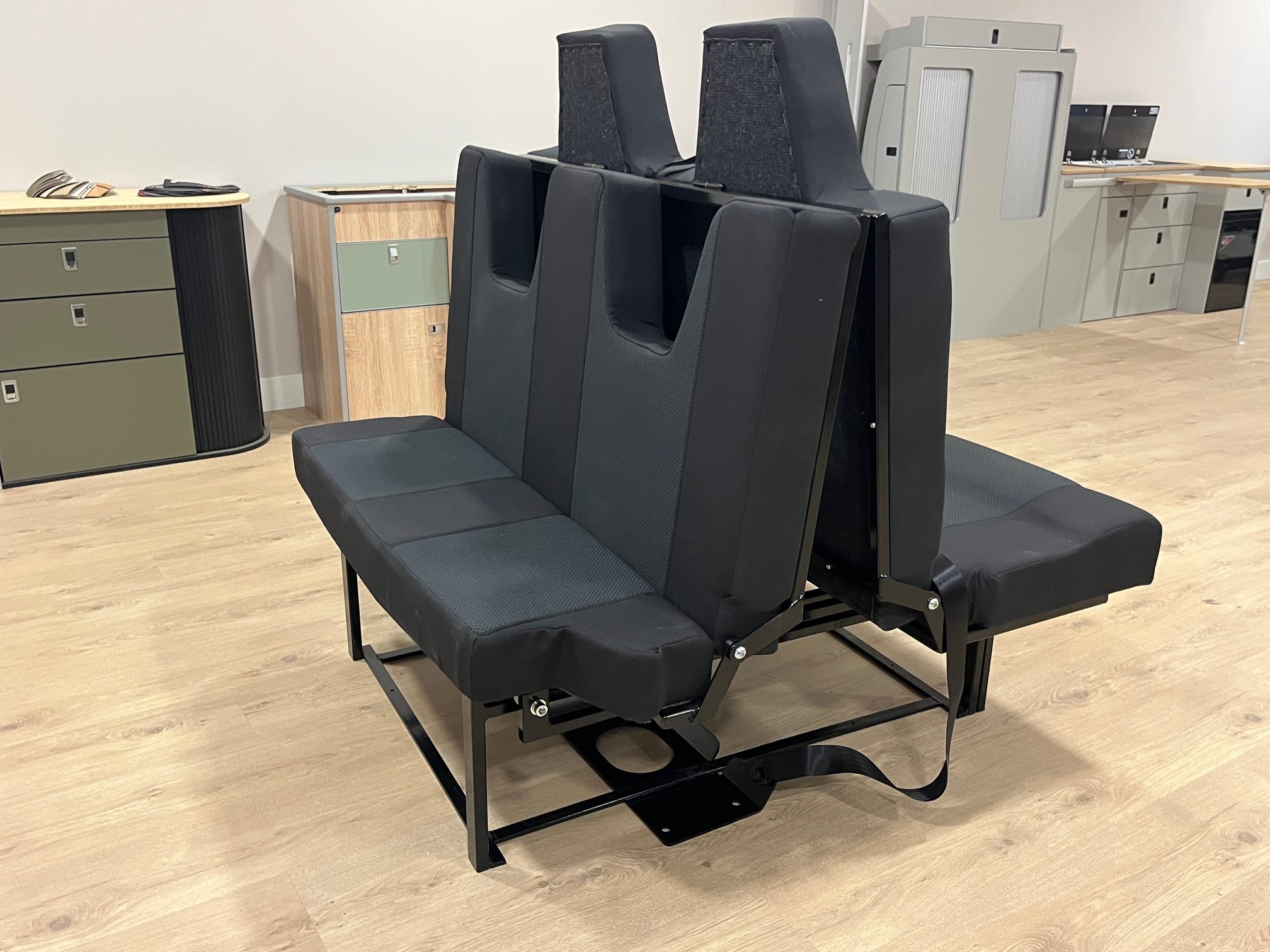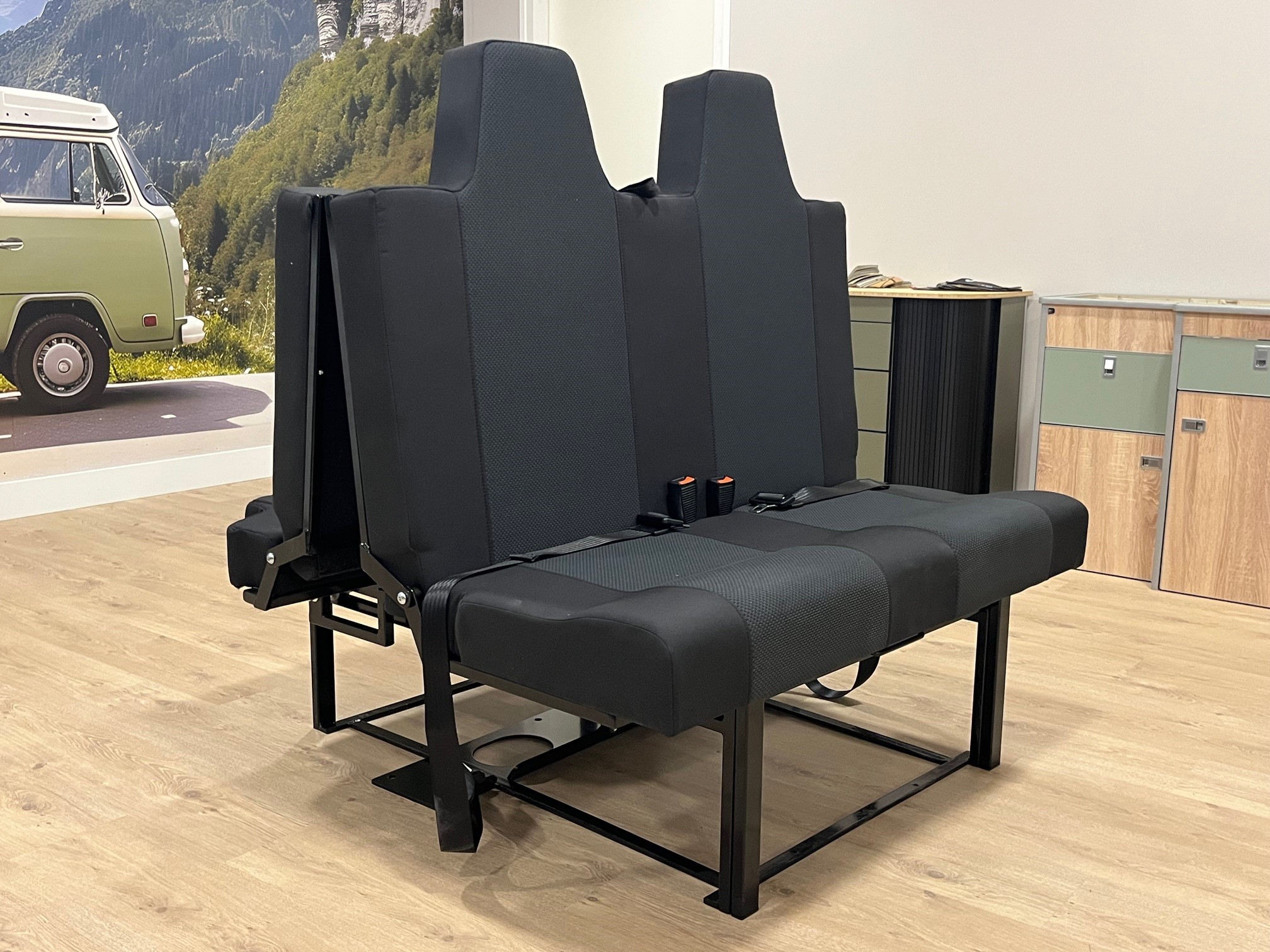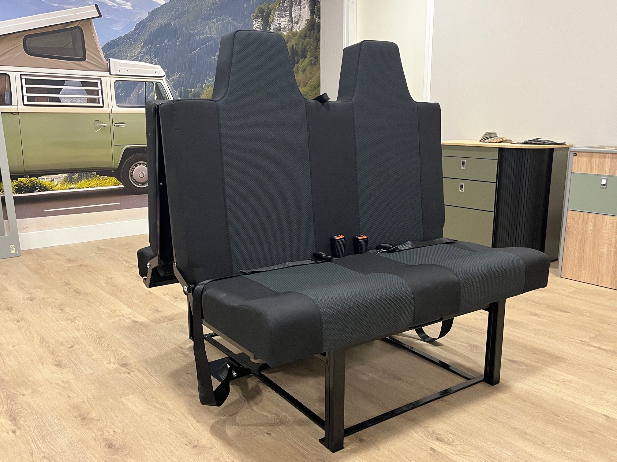 Gestoffeerde zit/slaapbank Rock ’n Roll bed voor een buscamper met gordels voor twee extra zitplaatsen.