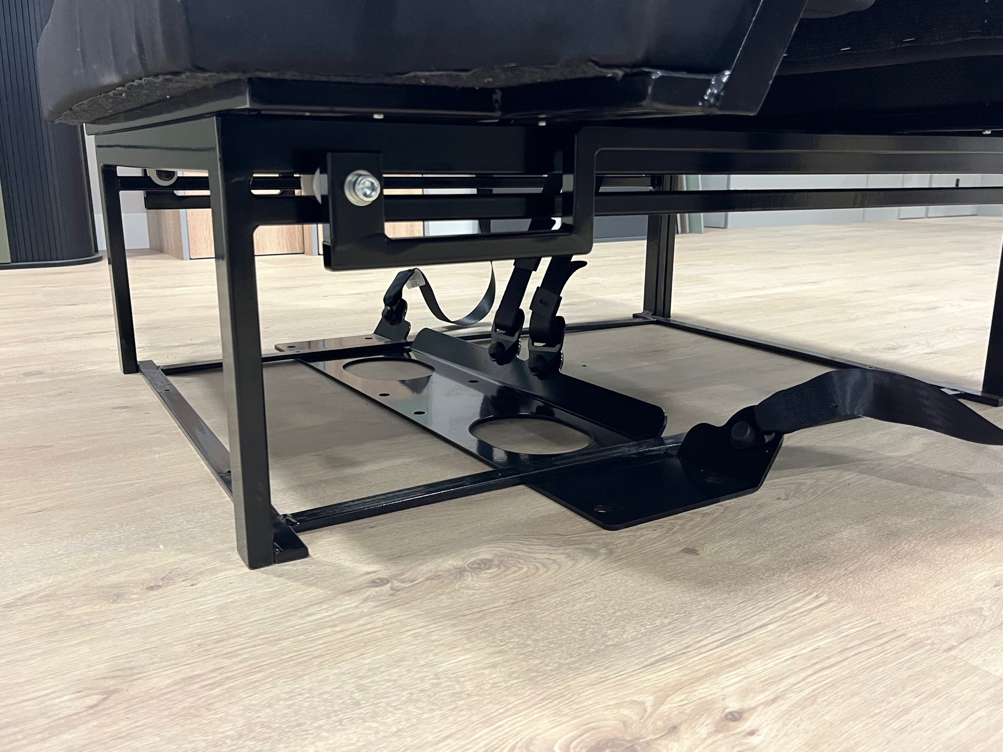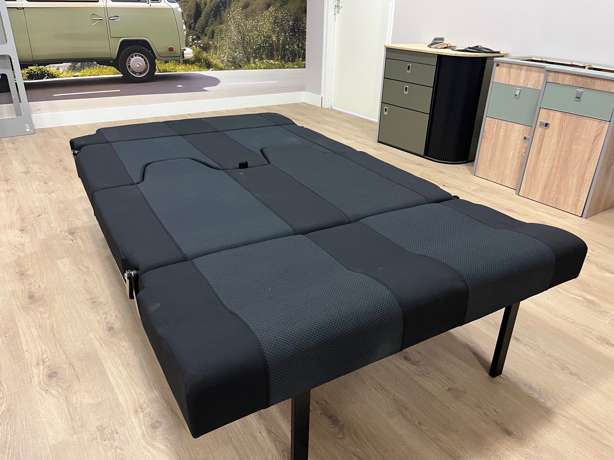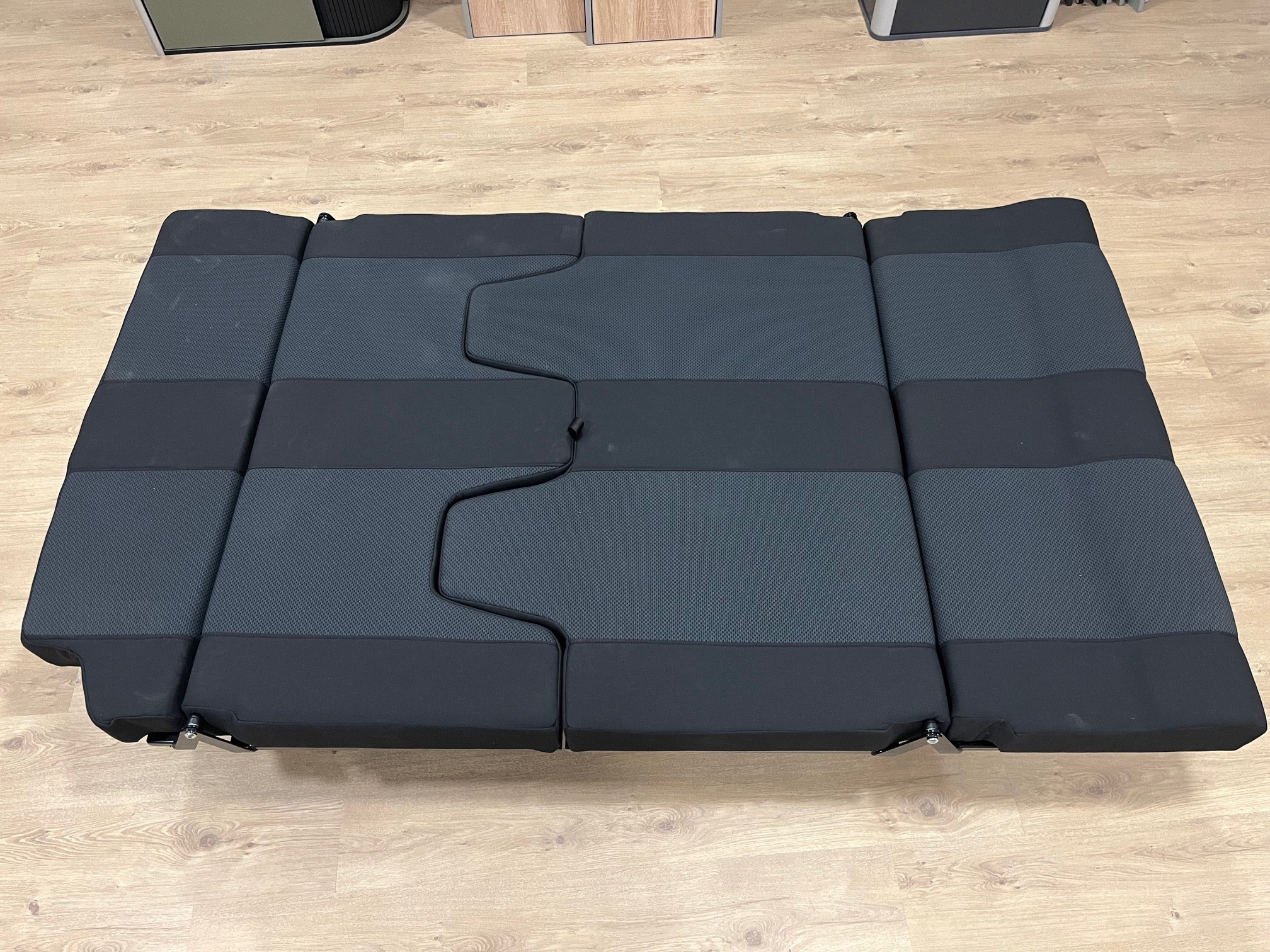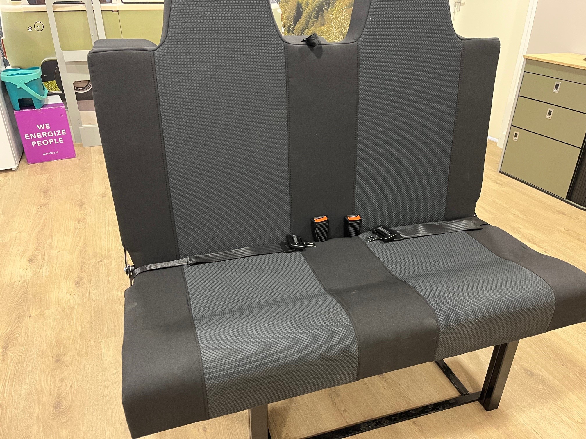 Gestoffeerde zit/slaapbank Rock ’n Roll bed voor een buscamper met gordels voor twee extra zitplaatsen.