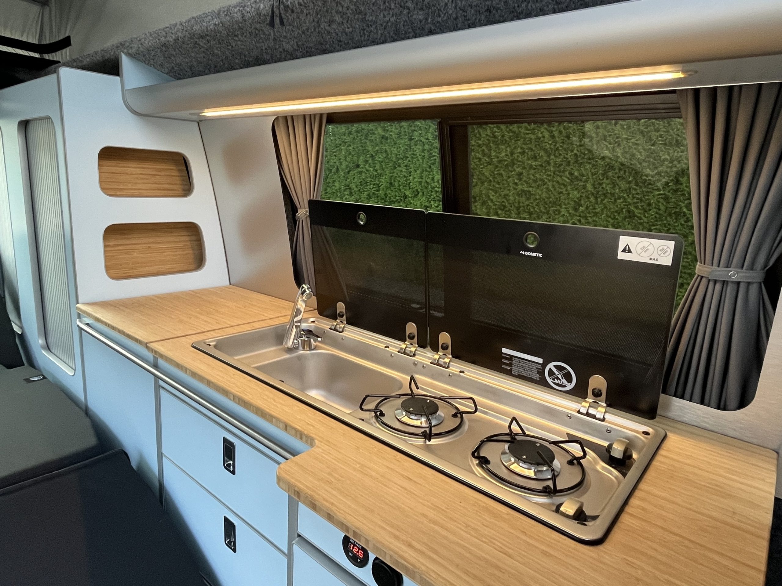 Leeslamp + dimbare LED-lamp boven kookgedeelte met opbergruimte
