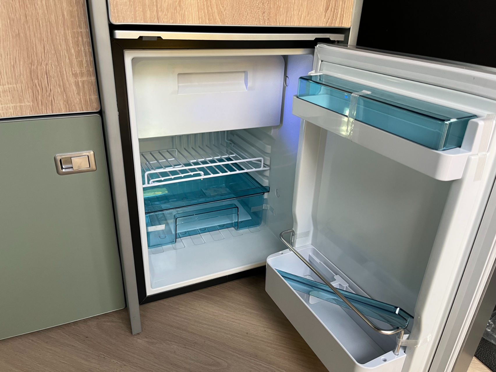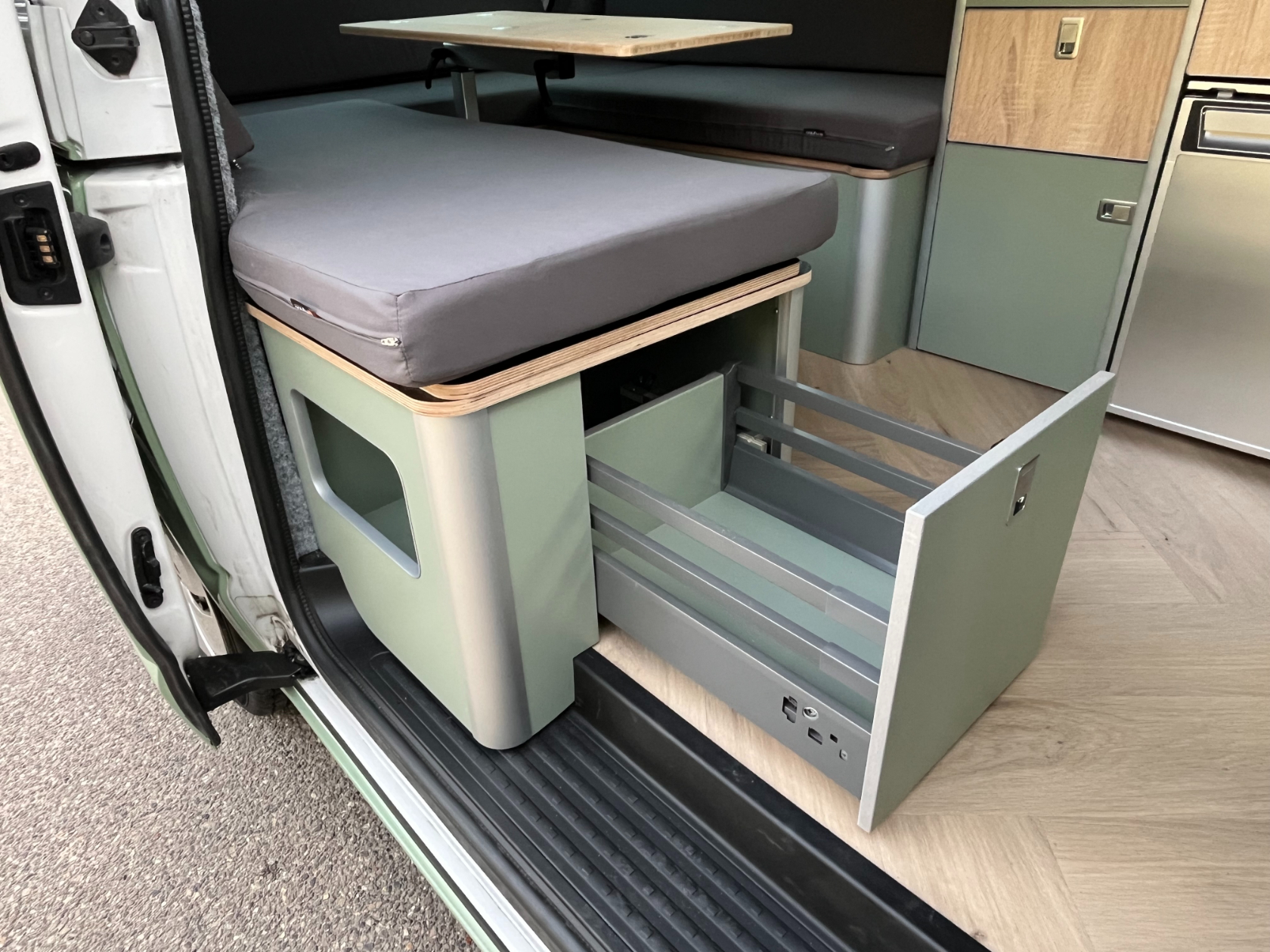Groot slaaphefdak uit eigen productie in safarikleur. Aan de voorkant een raam, links/rechts ventilatiehorren. Voorbereiding voor twee slaapplekken bovenin 180x110cm.