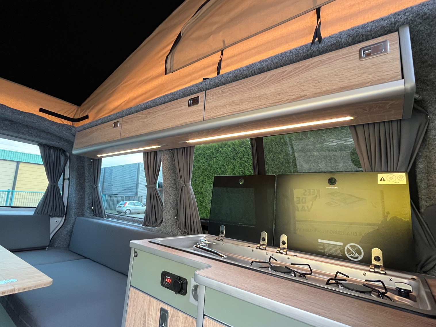 Leeslamp + dimbare LED-lampen boven kookgedeelte met opbergruimte