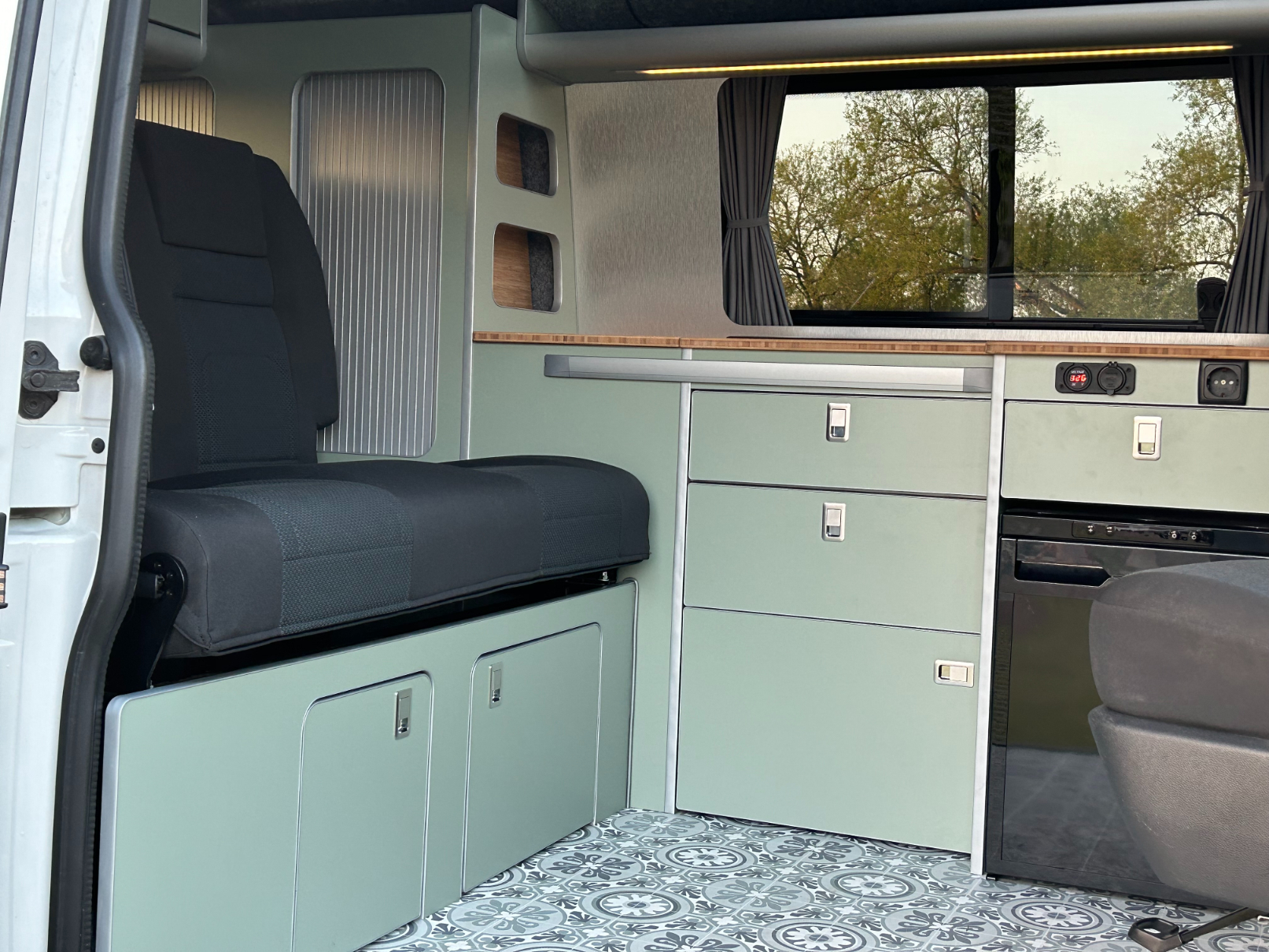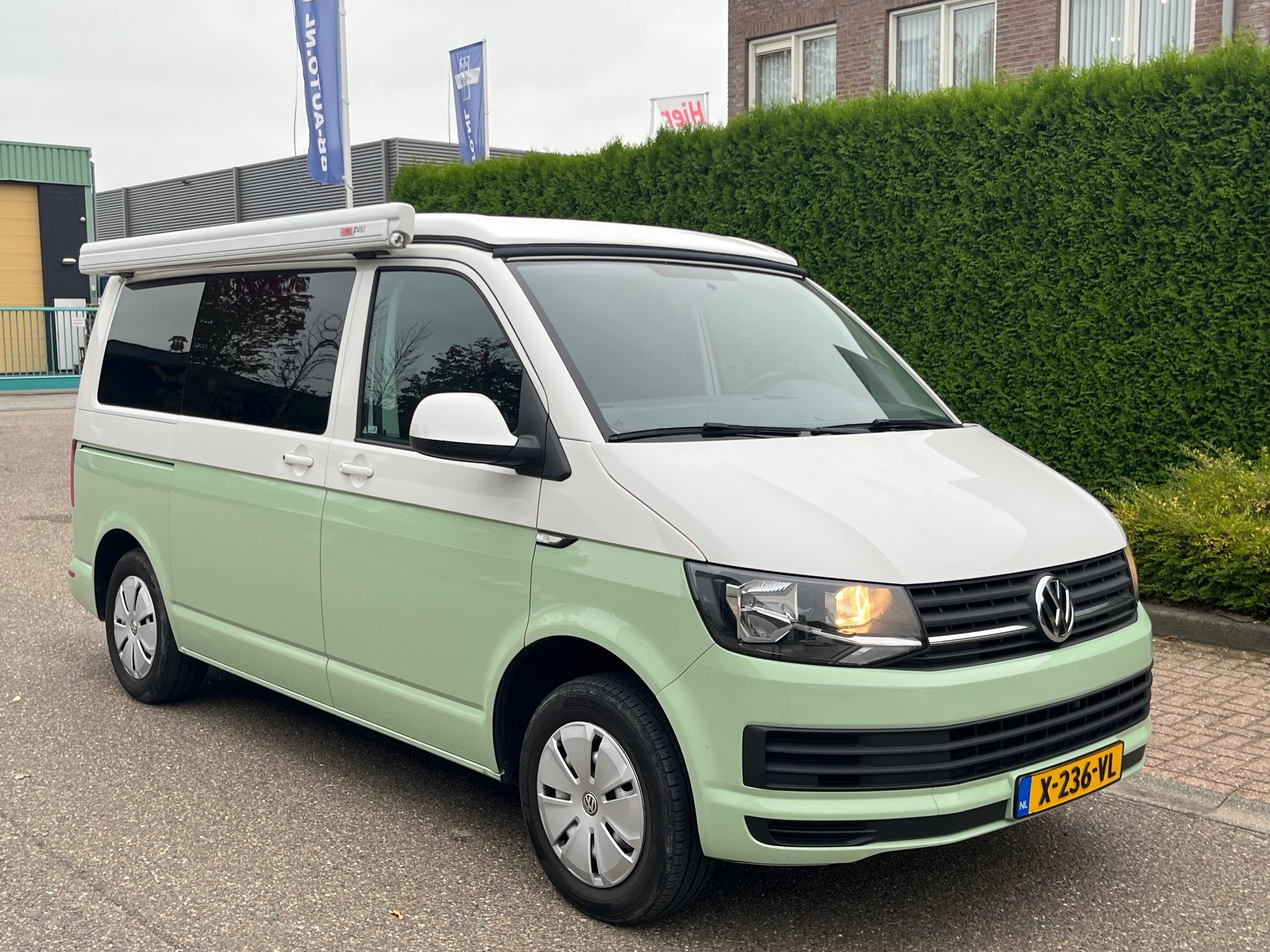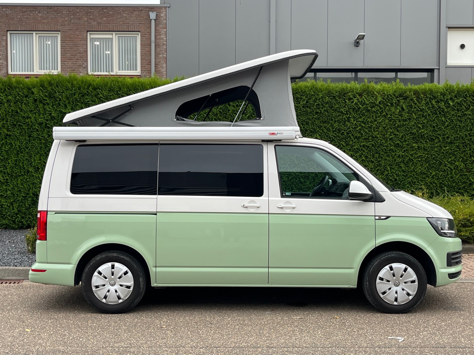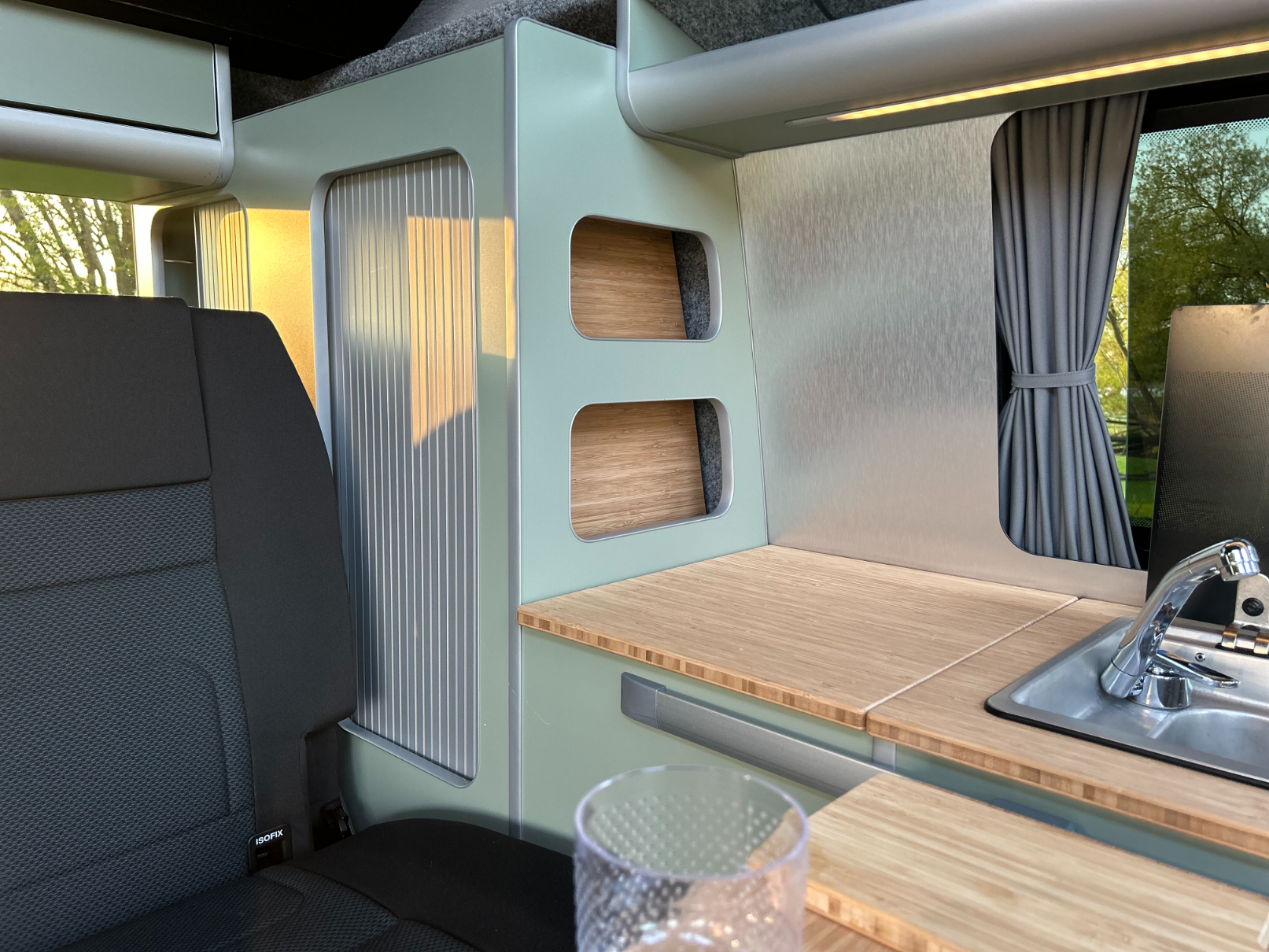 Het gaat om een prachtige in two-tone gespoten Volkswagen Transporter buscamper. Een tot “California” omgebouwde bestelbus, maar dan een stuk sfeervoller door de pastelgroene inrichting.