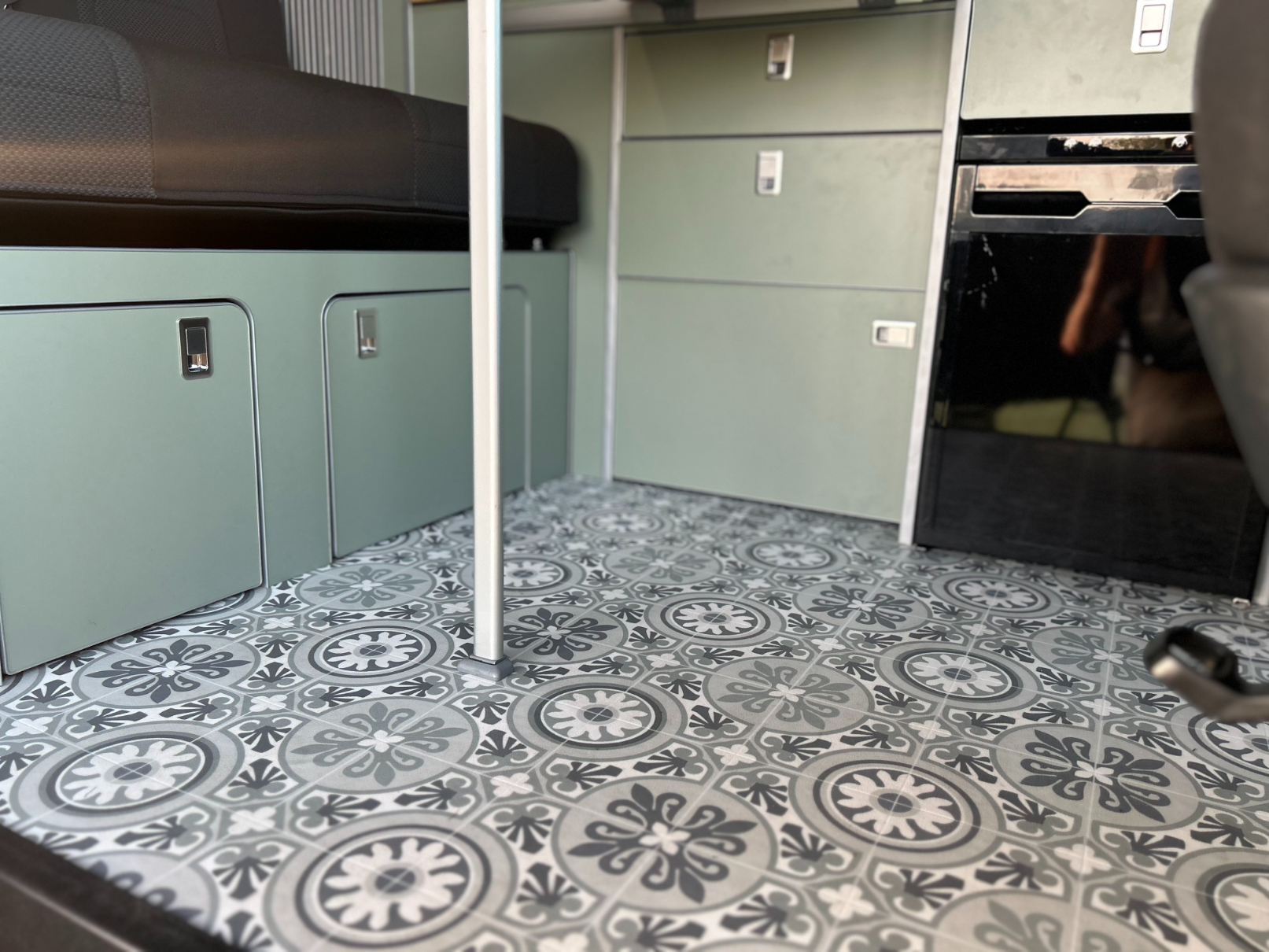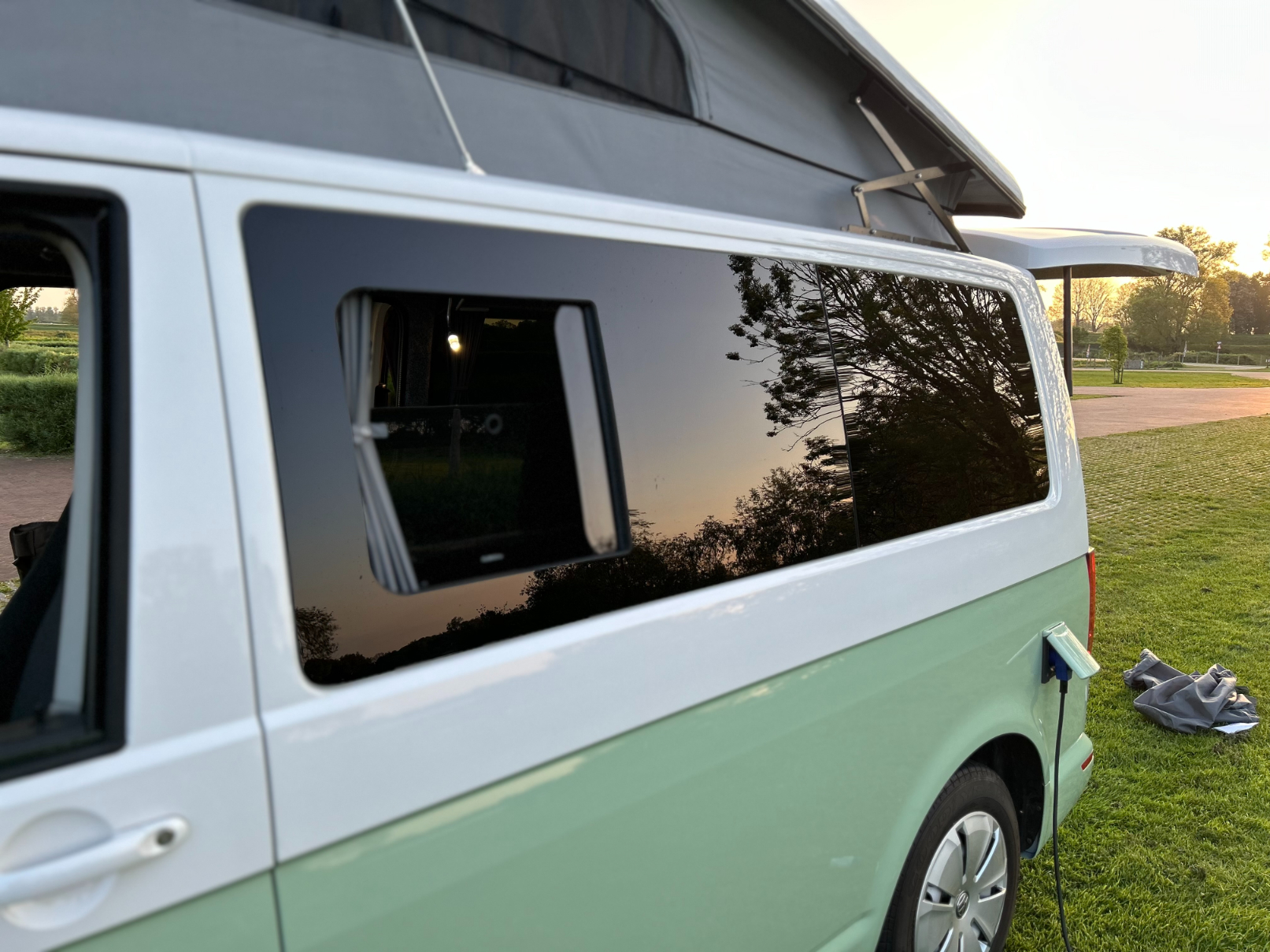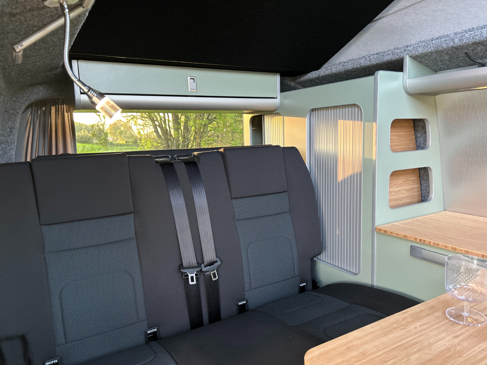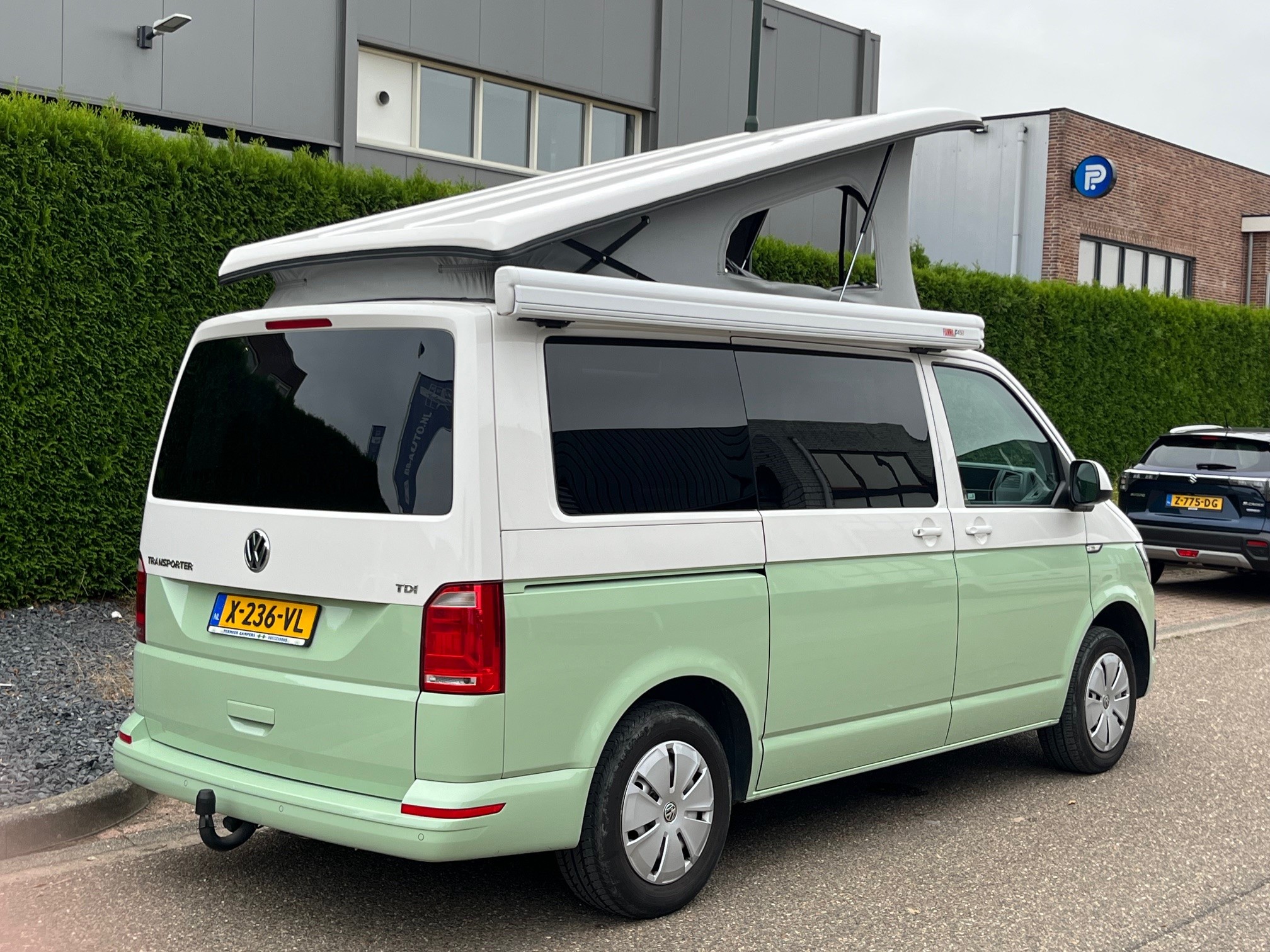 Het gaat om een prachtige in two-tone gespoten Volkswagen Transporter buscamper. Een tot “California” omgebouwde bestelbus, maar dan een stuk sfeervoller door de pastelgroene inrichting.