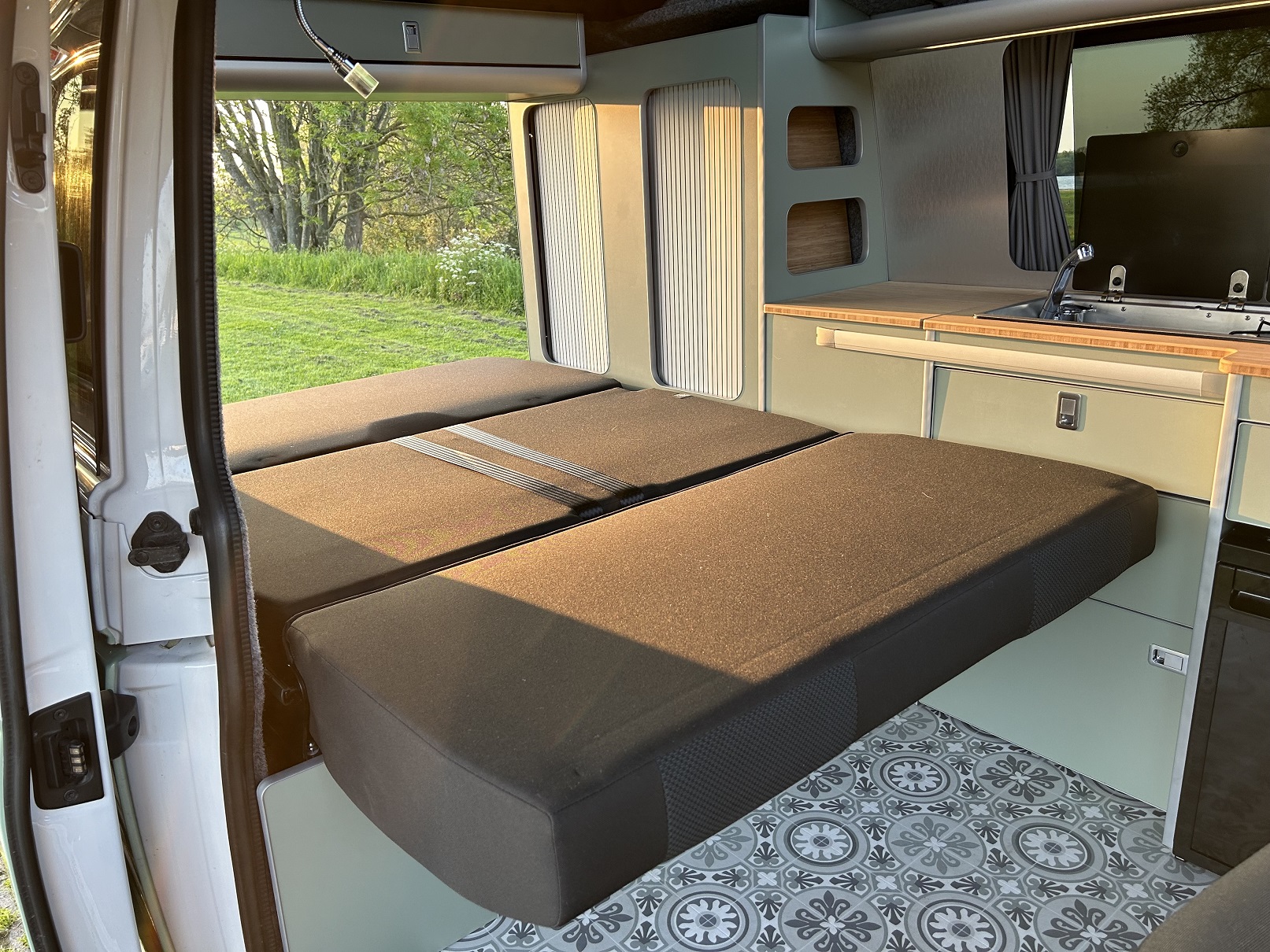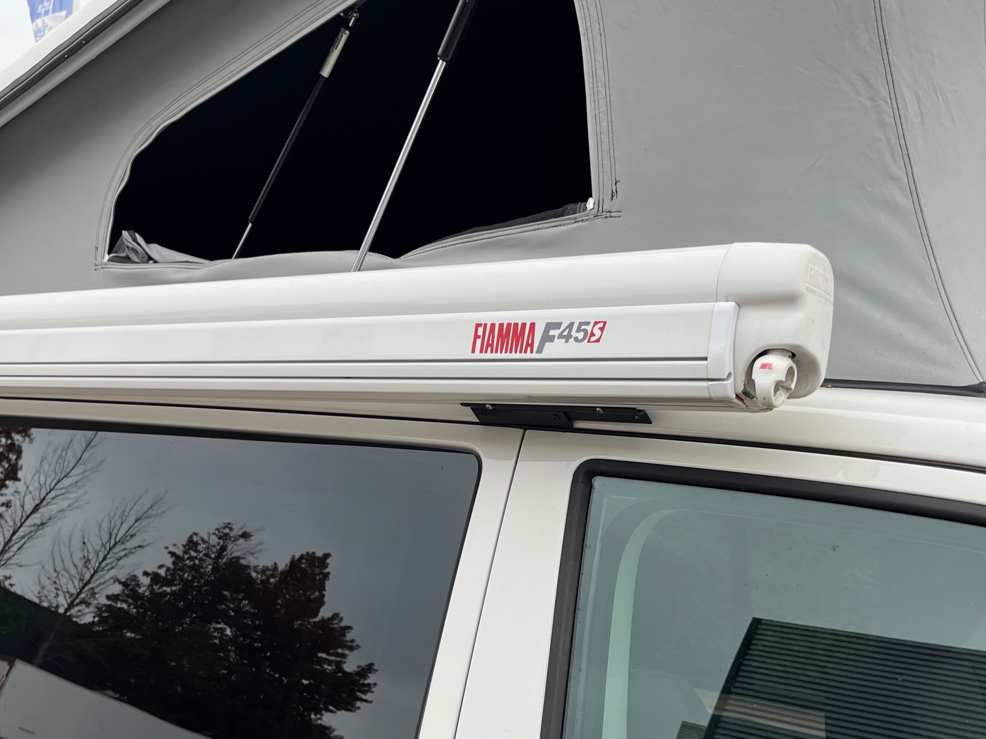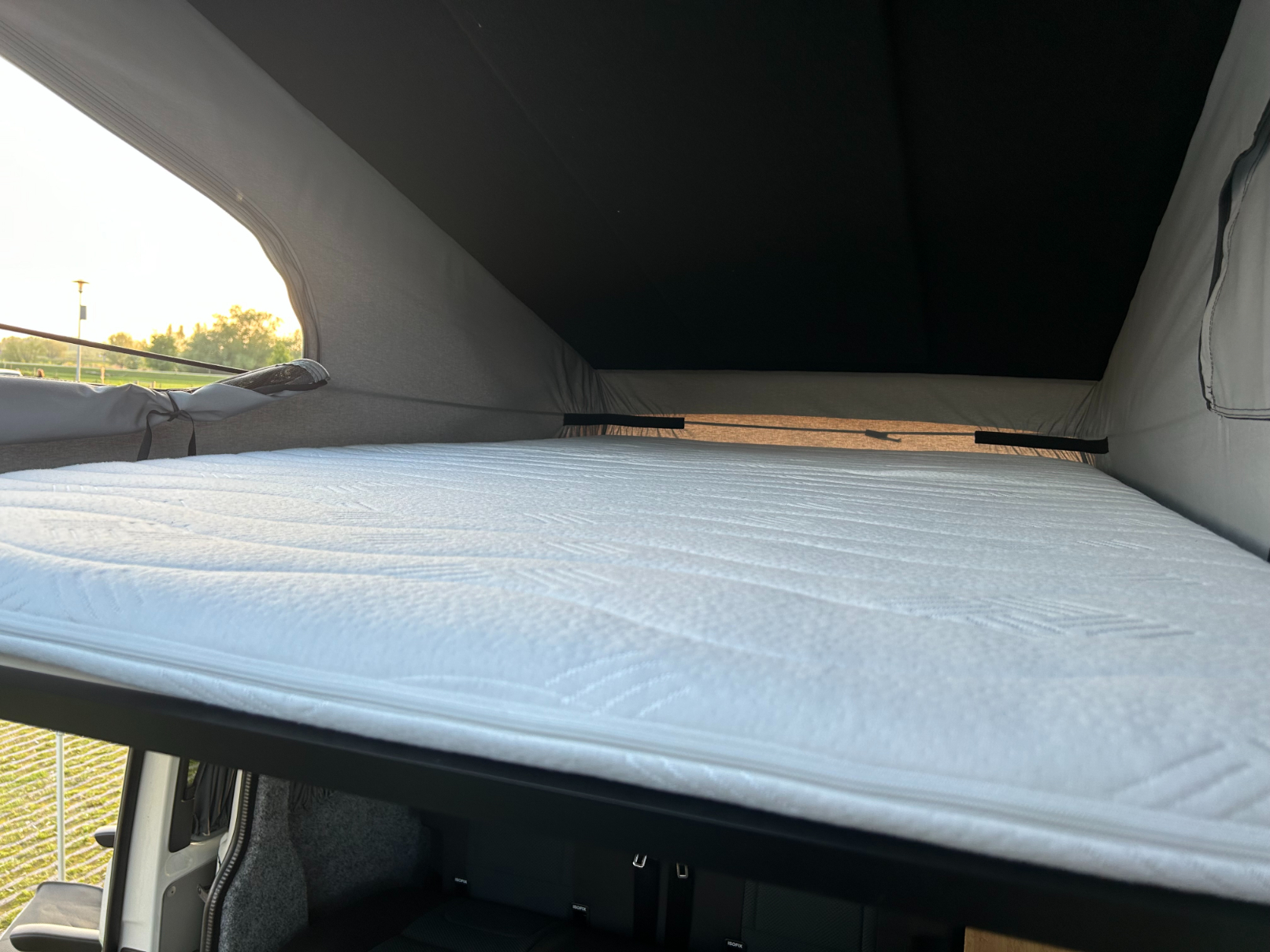 De camper is voorzien van een groot slaaphefdak met twee slaapplaatsen bovenin. De afmetingen van het bovenbed zijn 180x110cm. Wanneer je het bed niet nodig hebt, klap je het gemakkelijk naar boven met gasveren. Het raam en de horren van het tentdoek kunnen helemaal worden opengeritst. Het mooie lichtgrijze tentdoek geeft veel daglicht.