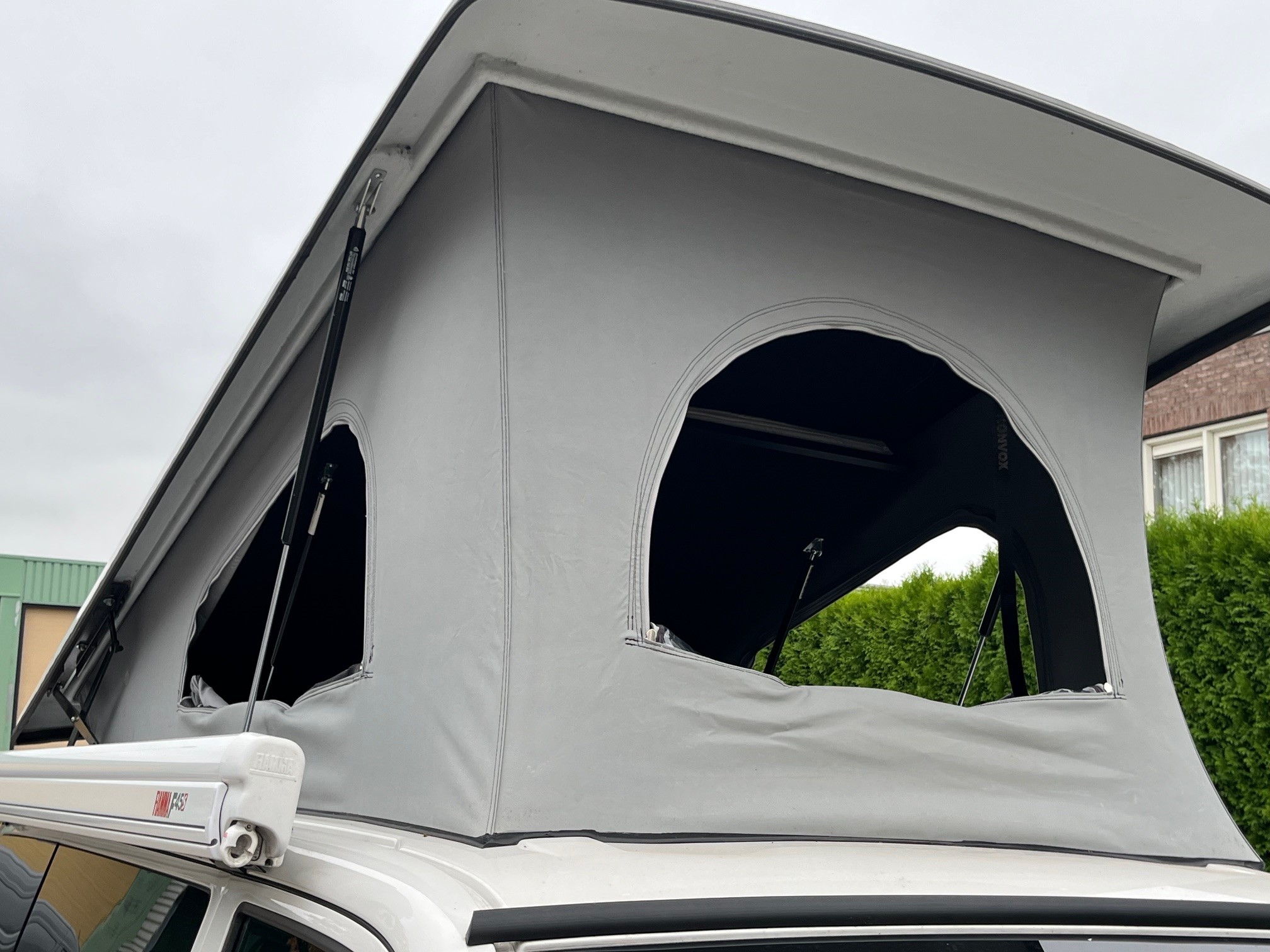 Groot slaaphefdak uit eigen productie. Aan de voorkant een raam, links/rechts ventilatiehorren. Sky Open open te ritsen.