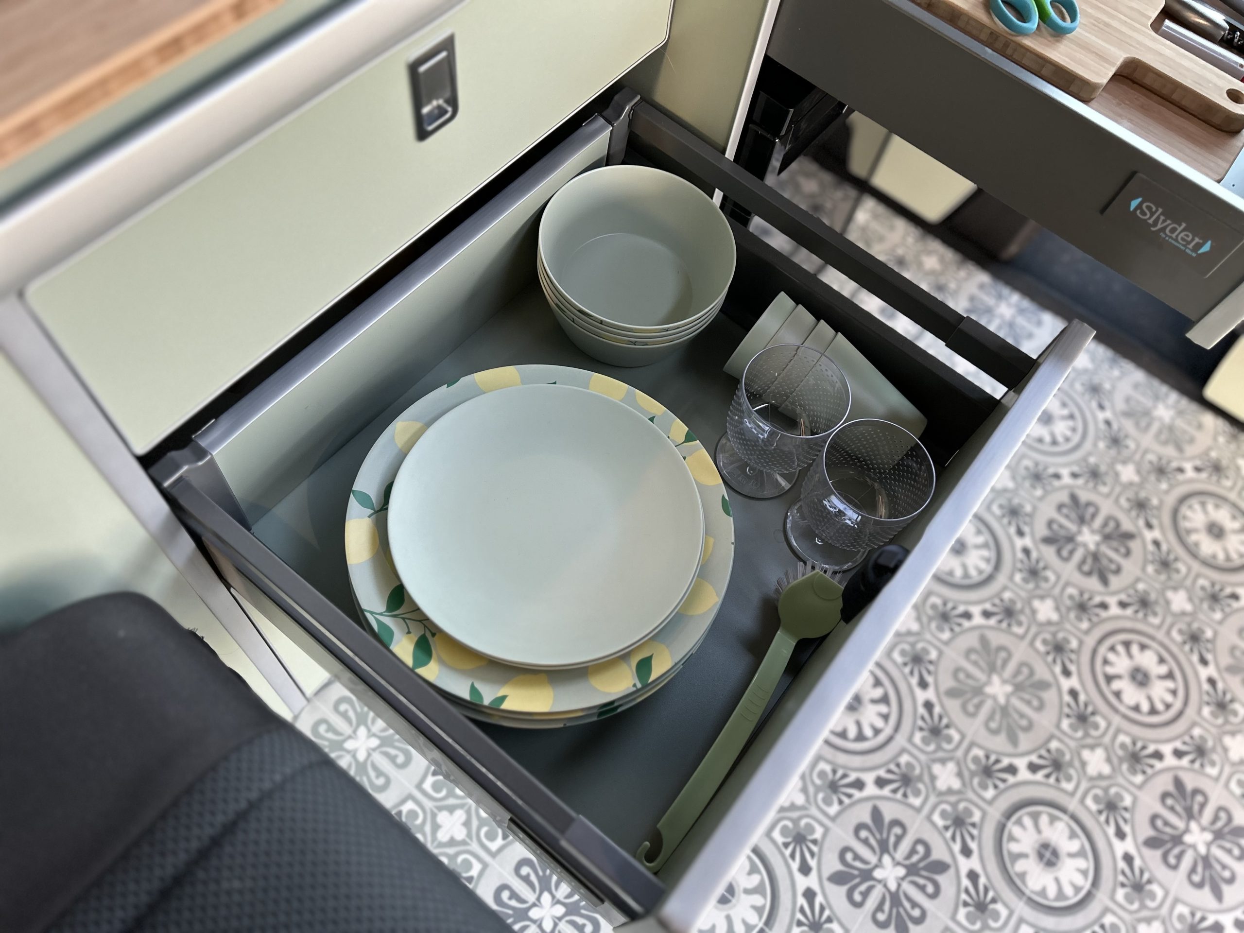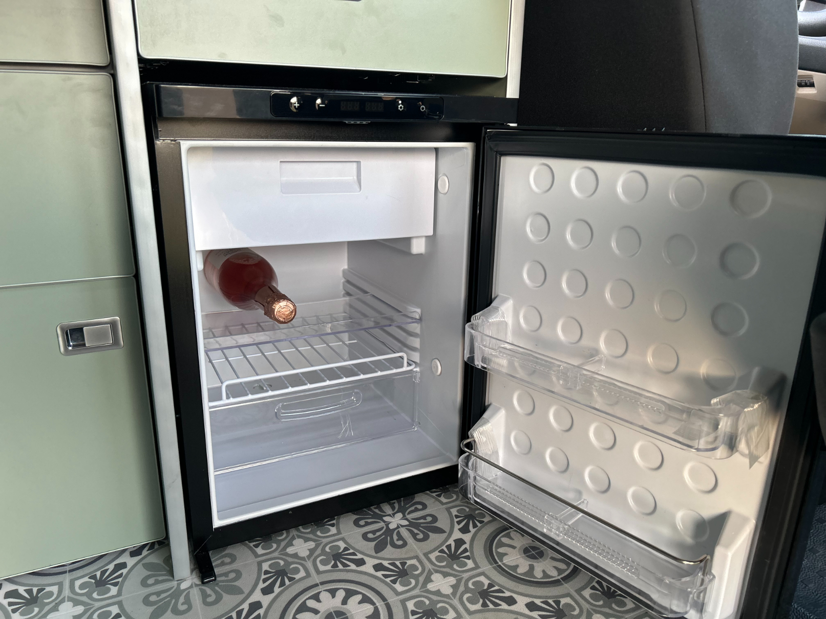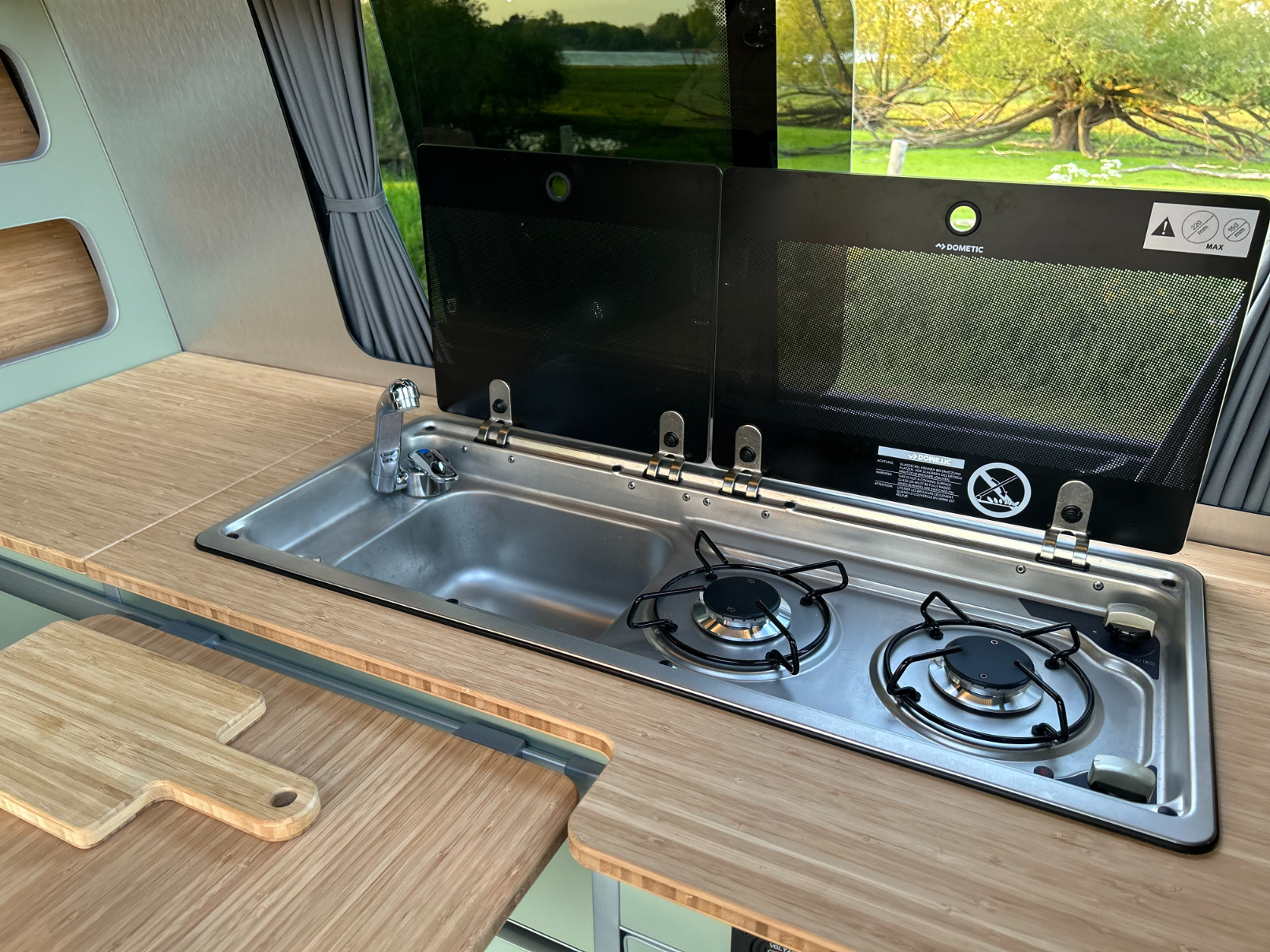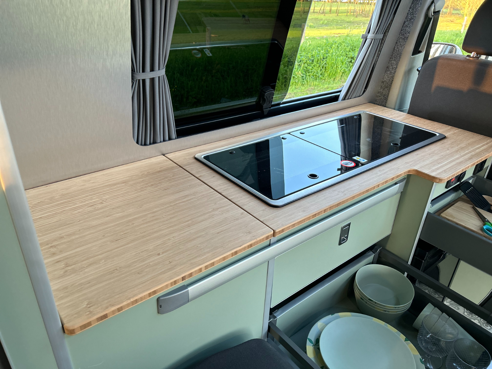 De keuken is uitgevoerd met een tweepits kookspoelcombinatie en een koelkast (50L) met uitneembaar vriesvak. De schoon- en vuilwatertank (12L) en het gasflesje (Campingaz) staan onderin het meubel. Het werkblad en de tafel is van bamboe wat een mooie natuurlijke uitstraling geeft. Er zijn voldoende opbergmogelijkheden en de ruimte is voorzien van LED-verlichting.