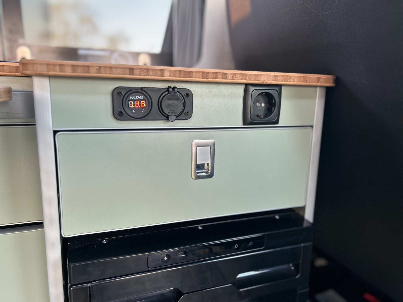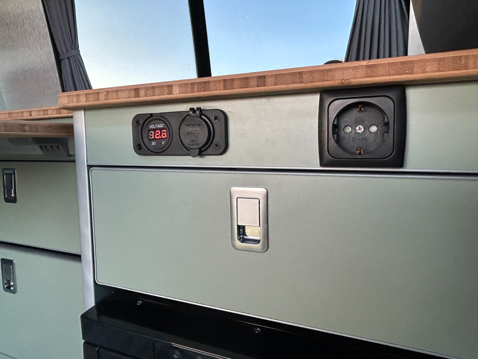 De huishoudaccu wordt tijdens het rijden automatisch opgeladen en voedt de koelkast, waterkraan, verlichting en de USB-chargers. Het 230V stopcontact werkt alleen als de camper aan de walstroom staat. Op die manier wordt ook de huishoudaccu bijgeladen.